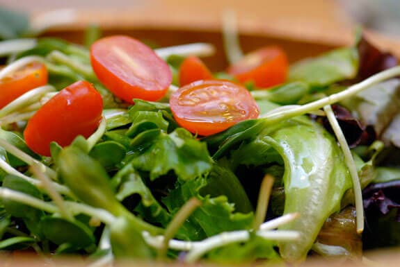 Sunflower Microgreen Salad Serves 6 Ingredients 4 cups mescalin greens 1 (3 oz) package sunflower sprouts 1 cup sugar plum tomatoes, sliced in half 2 tablespoons olive oil 2 teaspoons lemon juice, fresh squeezed Instructions Immerse mesclun greens in a bowl of water, then spin greens dry in a salad spinner Immerse sprouts in a bowl of water, pick out any remaining seed shells from the sprouts, then spin dry Place greens, sprouts and tomatoes in a large salad bowl Drizzle with olive oil, then lemon juice Toss and serve My husband took the boys skiing, hence the porch sitting, and time for a leisurely grocery trip as well. I called my friend Tara and we met at the market so that we could chat and do our shopping together. We had fun looking over all of the spring produce and were completely inspired. The sunflower sprouts caught my eye, as did the sugar plum tomatoes. I picked up a pack of each, eager to inaugurate my spring salad festivities. On these sunny days, our healthy dinner is a protein (chicken or fish) and two or three side salads. When the weather warms, I eat as much raw food as I can. My husband too –he helped me devour this one!